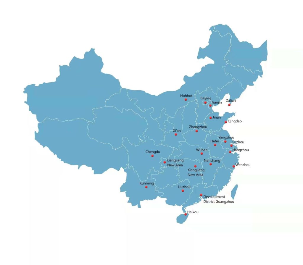 Beijing, Tianjin, Chongqing Liangjiang New Area, Dalian, Hangzhou, Jinan, Qingdao, Chengdu, Wuhan, Xi’an, Hohhot, Nanchang, Suzhou, Yangzhou, Hefei, Zhengzhou, Hunan Xiangjiang New Area, Guangzhou Development Zone, Liuzhou, Haikou, Kunming, Wenzhou.