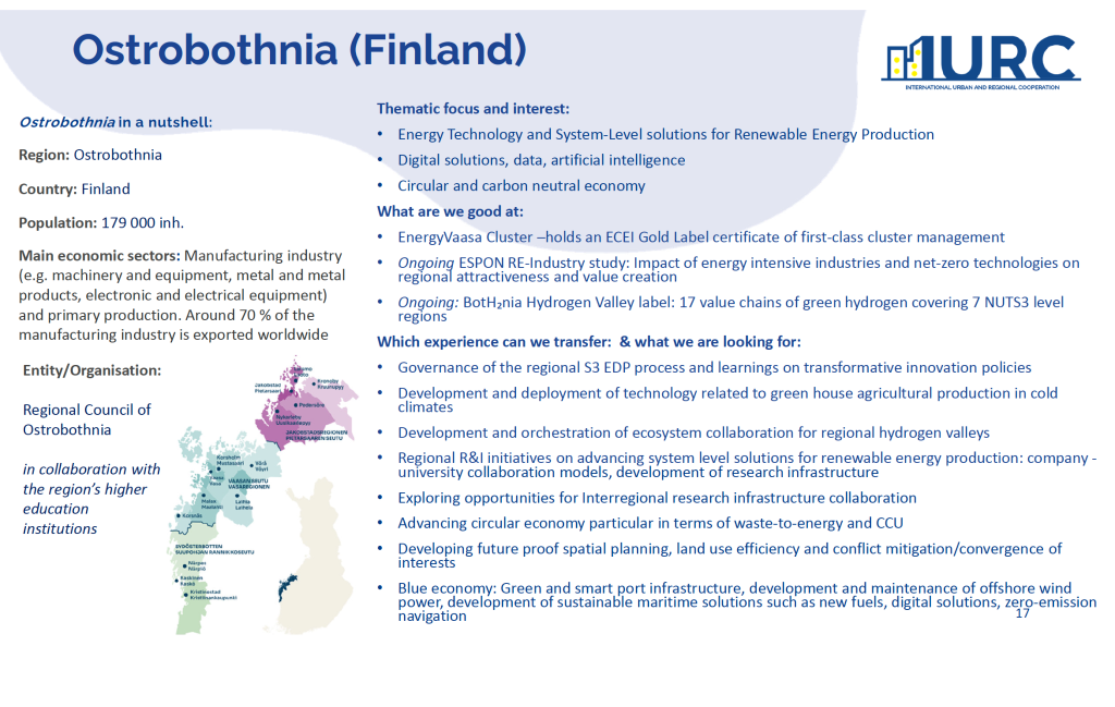Ostrobothnia (Finland) – Johanna Dahl presented the region’s strong manufacturing base and energy technology cluster, along with projects like ESPON Re-Industry and the Bothnia Hydrogen Valley, focusing on wind and hydrogen cooperation.
