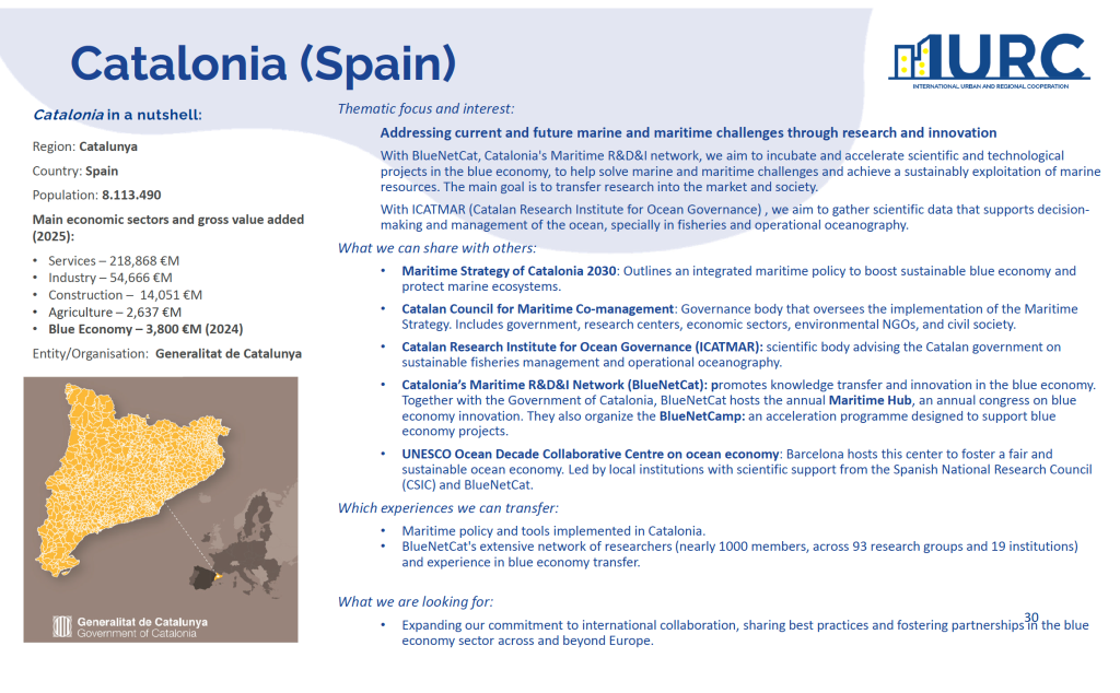 Catalonia (Spain) – Lia Brum presented the regional maritime strategy and research institutions, including the BlueNetCat network, advancing marine research and innovation.