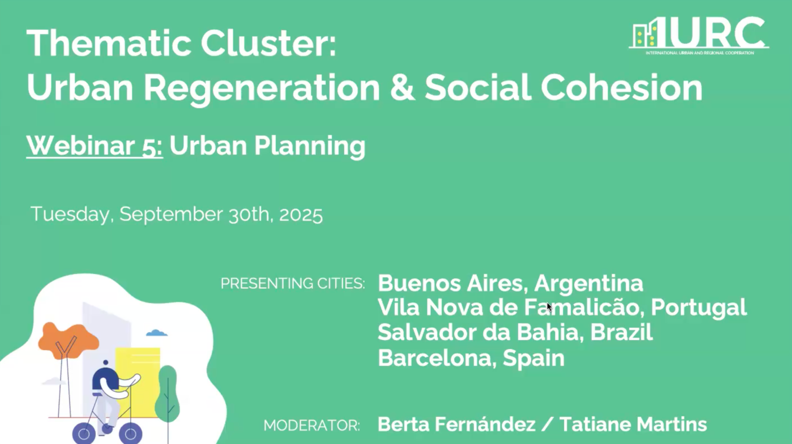 On 30 September 2025, the International Urban and Regional Cooperation (IURC) Latin America programme held its fifth thematic webinar, bringing together city leaders and experts to discuss strategies for urban regeneration and social cohesion. The event attracted close to 30 registrants and featured presentations from Buenos Aires (Argentina), Famalicão (Portugal), Salvador da Bahia (Brazil), and Barcelona (Spain).