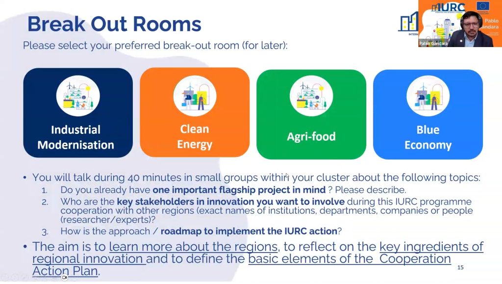 In closing, Pablo Gándara introduced the Region-to-Region Innovation Cooperation Plan, the operational framework guiding IURC’s second phase. He invited regions to submit short pilot action proposals by February 2026, outlining their flagship initiatives, partnerships, and expected outcomes.