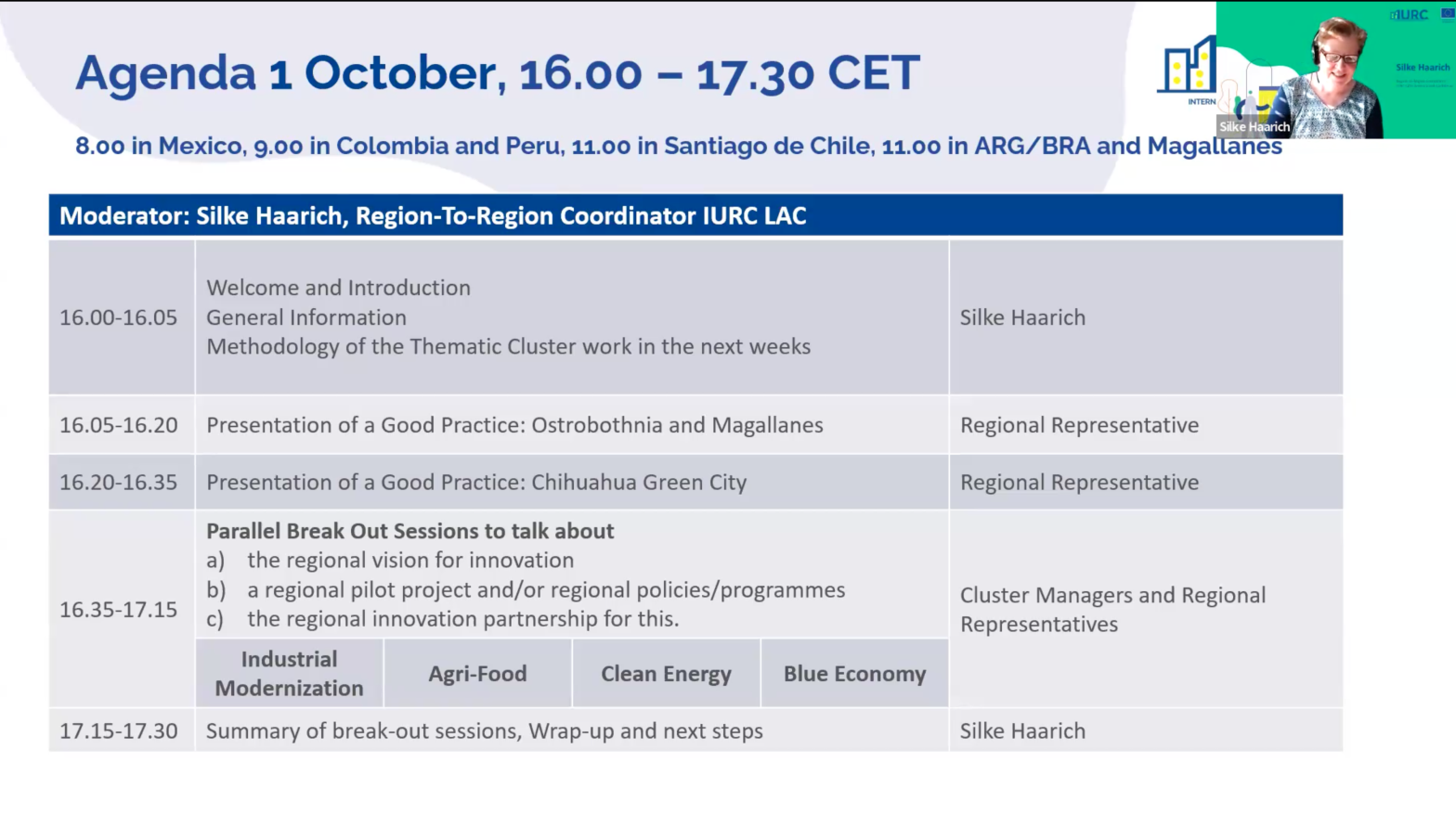 Silke Haarich, IURC-LAC Region-to-Region Coordinator, welcomed participants, addressed registration issues and outlined the agenda. The session structure included presentations of good practices, thematic breakout discussions, and a wrap-up on future steps. She underlined the methodology of geographical pairings that will lead to the drafting of RCAPs by March 2026.