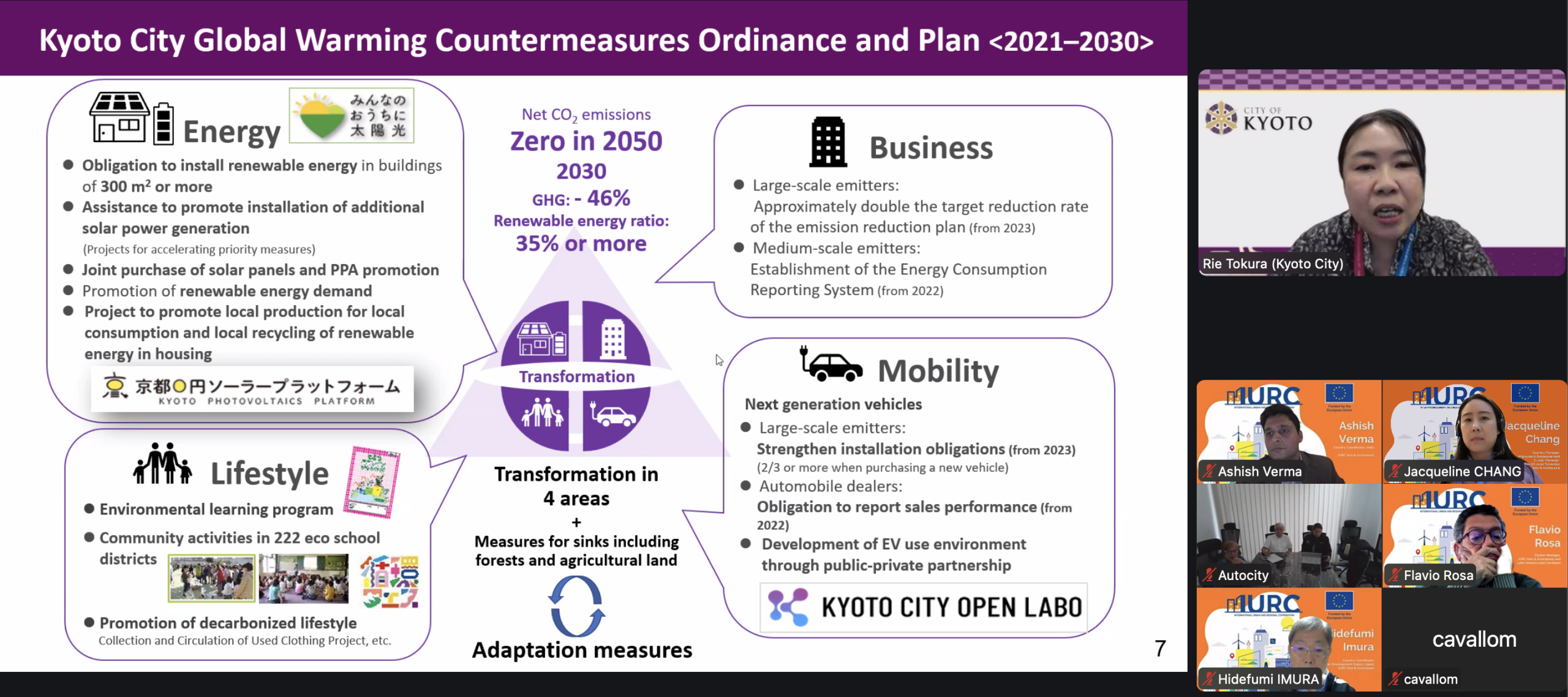 Rie Tokura, Assistant Director for International Cooperation at Kyoto City, presented the Kyoto Climate Action Plan 2050, which unites heritage preservation with forward-looking innovation. The city’s Comprehensive Climate Adaptation Ordinance (2018) integrates resilience across planning, public works, and land use.