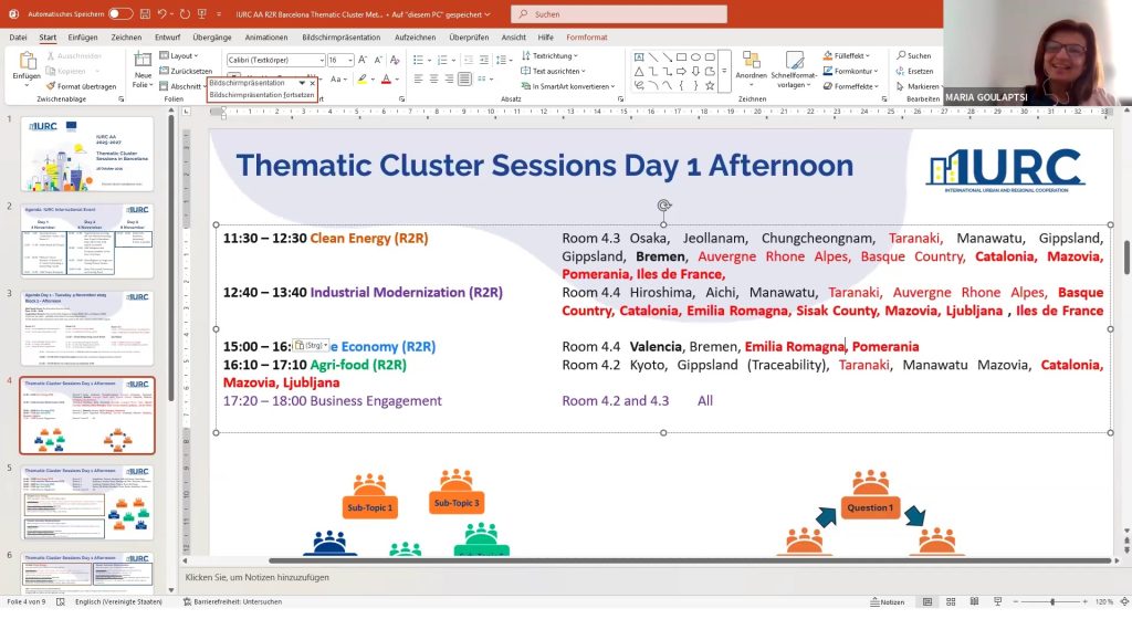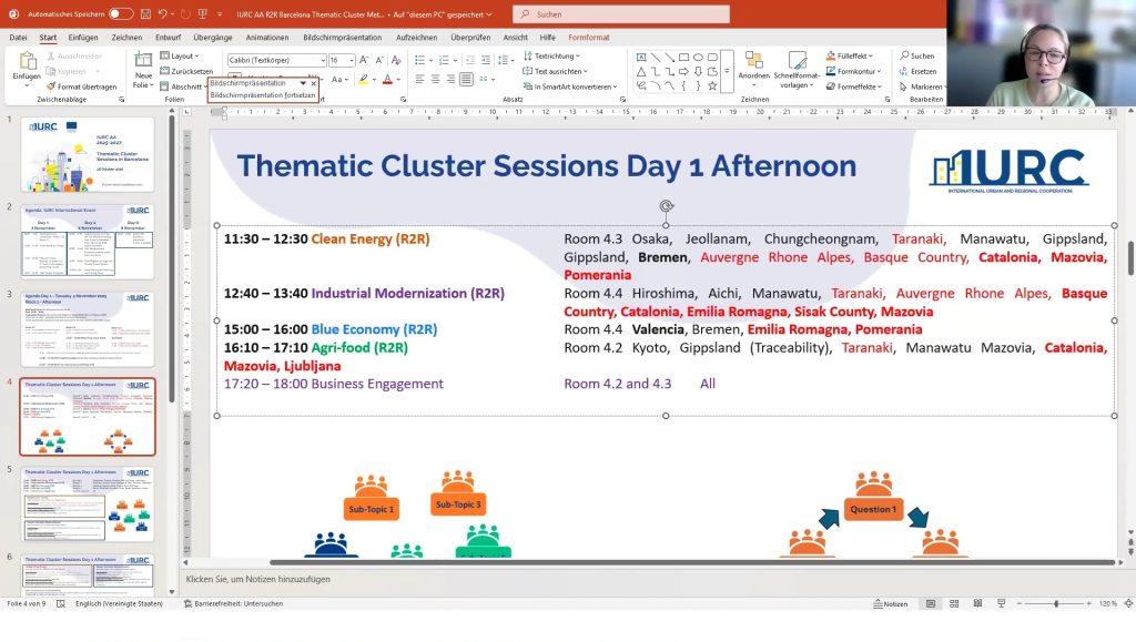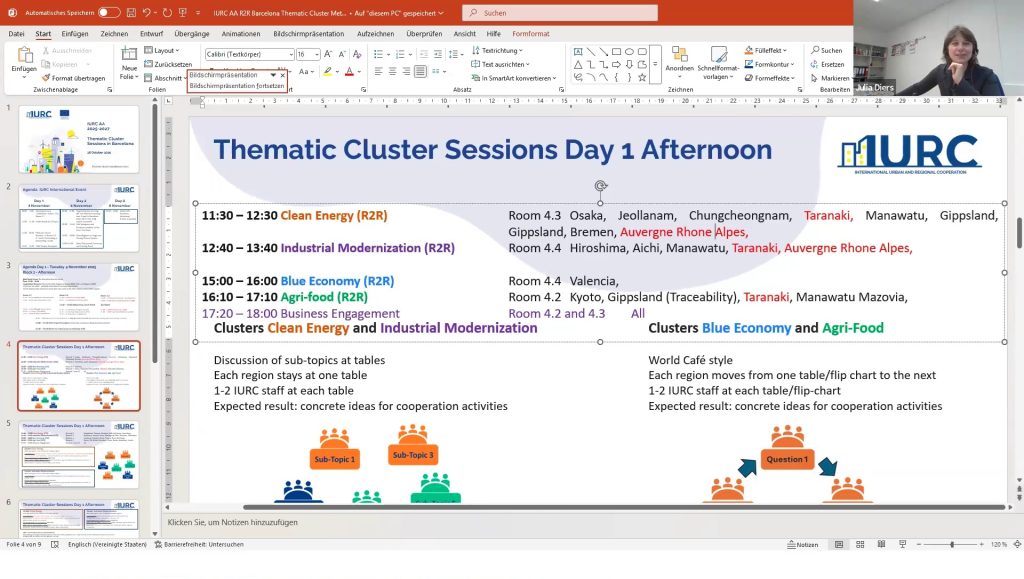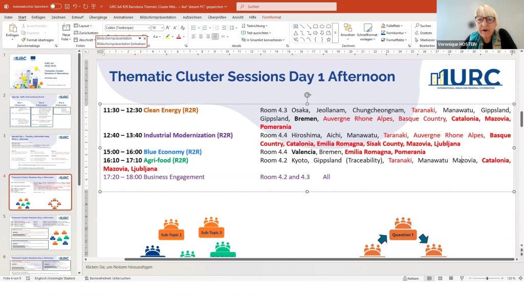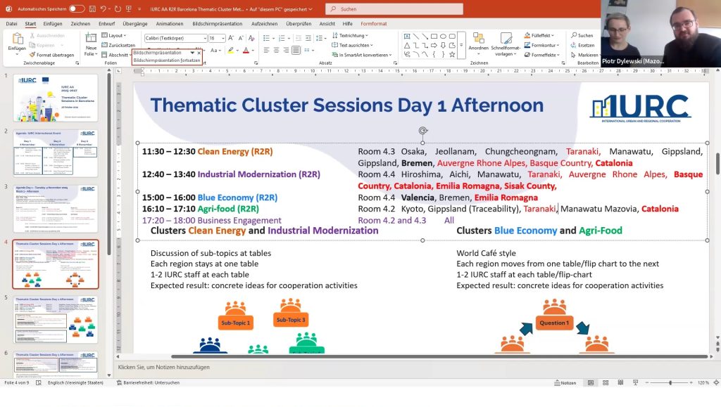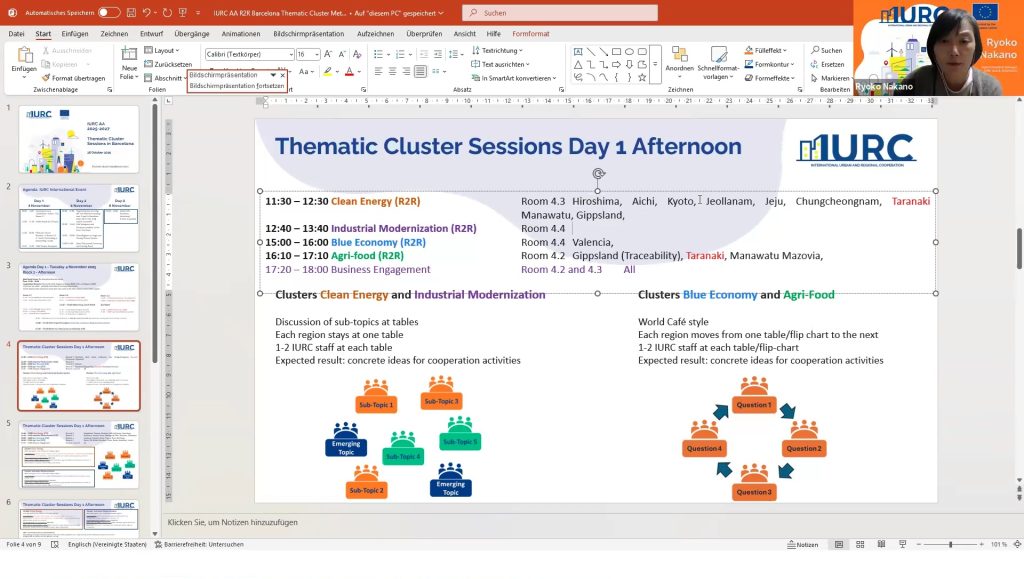 Pablo led a discussion on the thematic breakout sessions for pilot regions, focusing on clean energy, mobility, and agriculture. He explained the allocation of regions to specific clusters and encouraged participants to make choices regarding their attendance at the breakout sessions in Barcelona. IURC Japan colleagues Ryoko Nakano and Hidefumi Imura provided updates on Japanese regions, while IURC colleagues Bruce Wilson (Australia), Yookyung Oh (Korea) and Paul Dalziel (New Zealand) shared information on Australian, Korean and New Zealand regions breakout sessions attendance, respectively.