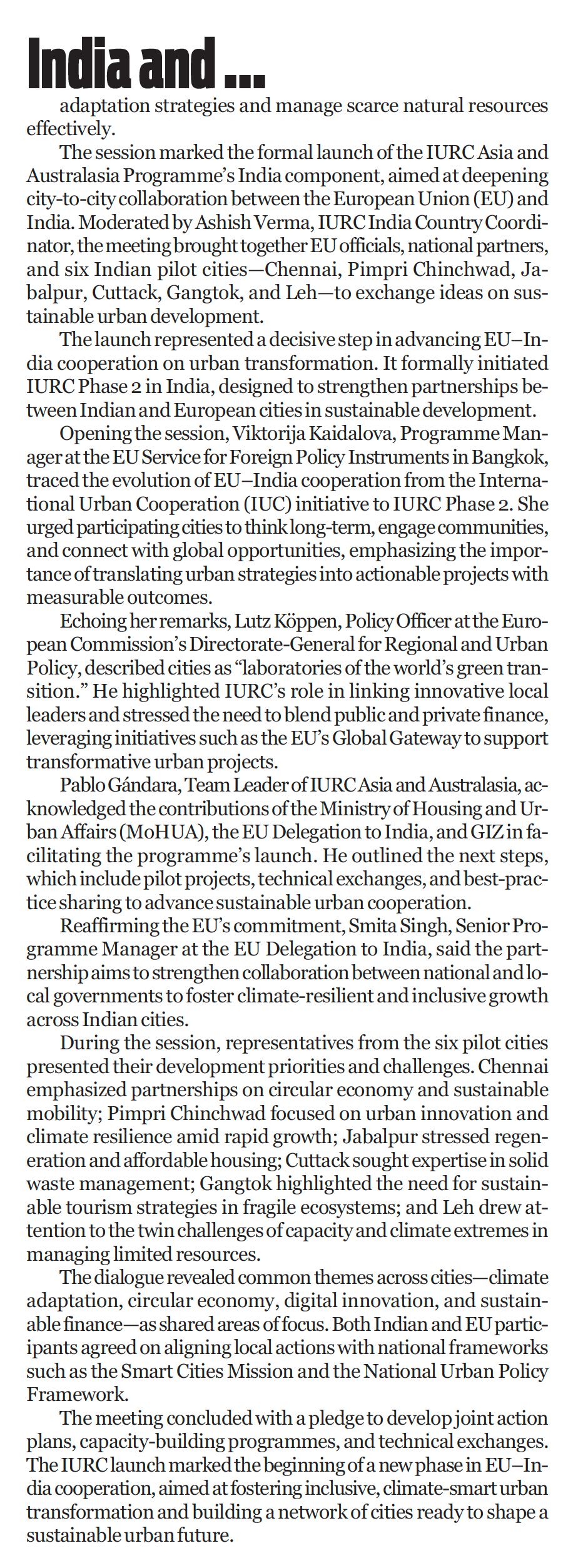 The articles highlight the selection of six Indian pilot cities — Chennai, Pimpri Chinchwad, Jabalpur, Cuttack, Gangtok, and Leh — under the IURC Asia & Australasia Programme, which promotes cooperation between European and Indian cities on sustainable, resilient, and inclusive urban development. Regional coverage in both Ladakh and Maharashtra emphasized that the programme will strengthen EU–India collaboration on climate action, innovation, and circular economy, while providing Indian cities with opportunities to share expertise and learn from global best practices.