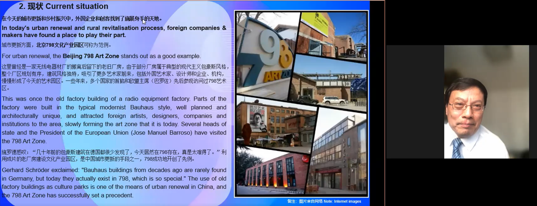 中国文化旅游部科技教育司原司长、全国旅游标准化技术委员会主任孙若风先生首先发表了“中国文旅产业在城市更新与乡村振兴中发挥的作用”的演讲。他分析中国 “十四五 “旅游发展规划的影响和机遇、强调旅游战略与城乡发展间的互动关系,并列举了文化和旅游发展及其与城市更新和乡村振兴互动的具体优秀案例。