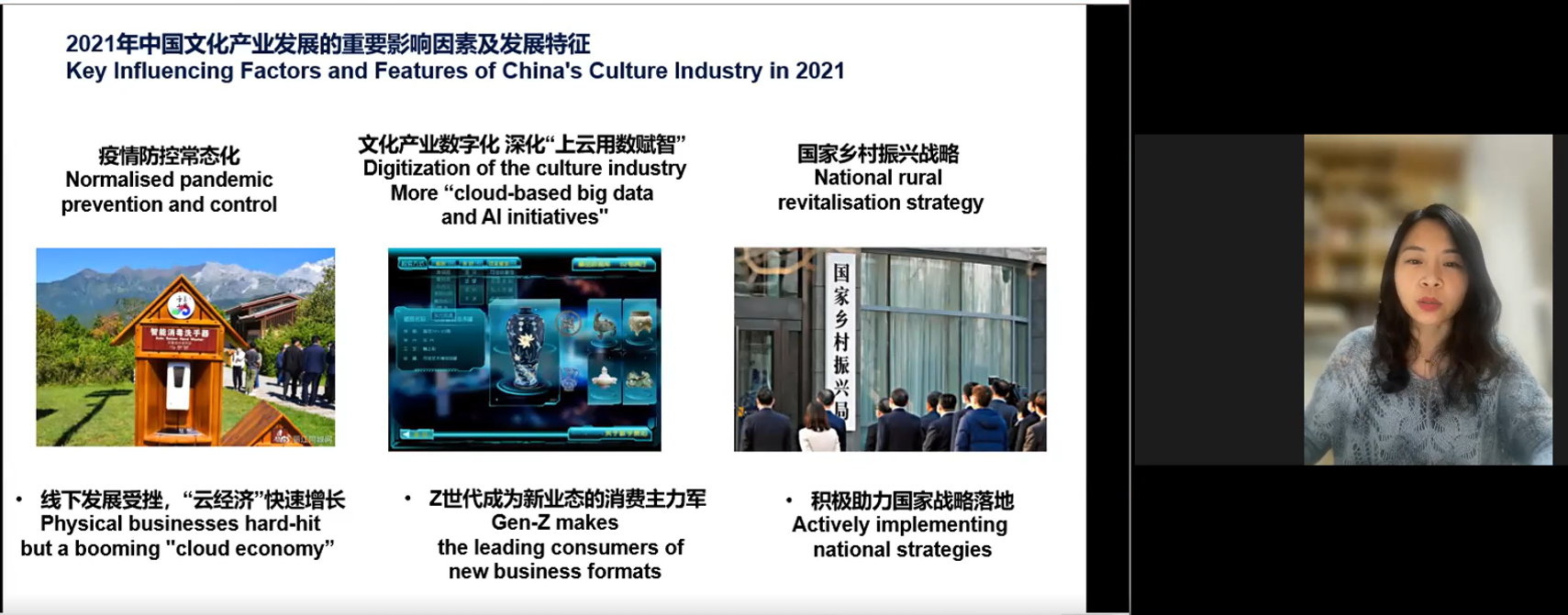 紧接着,中国人民大学文化产业研究院对外合作部主任周意女士介绍了中国数字文化旅游的创新实践和未来趋势。她回顾了中国文化产业的主要参与者,盘点了2021年中国文化产业的“十二大”热点现象。