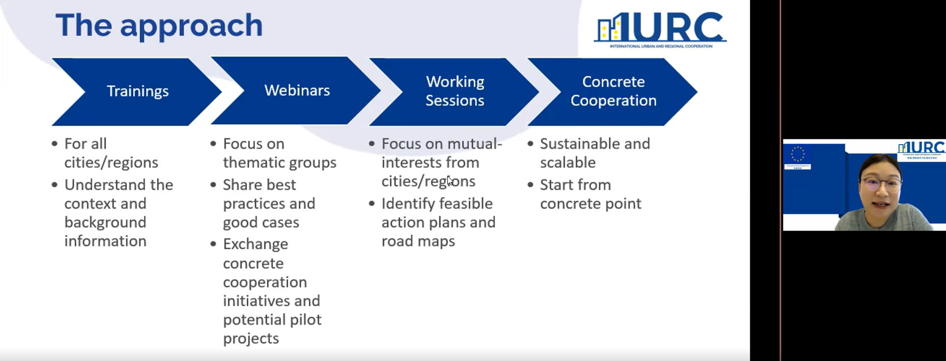 IURC China项目主任王倩女士代表项目办公室感谢欧洲案例城市及区域对项目的信任与支持,她介绍了项目的优先合作主题及执行方式,并且分享了包括培训、对接会等一系列的2022年的重点活动计划。
