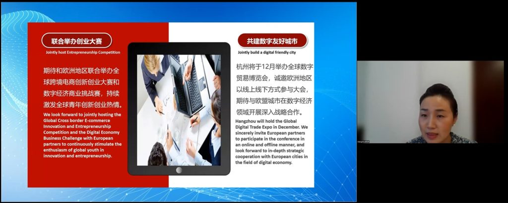 2021年11月,杭州首次入选成为中欧区域政策合作中方案例地区,并选定跨境电子商务为着眼点,积极探索在数字经济及数字化转型领域的对欧合作。2022年9月,在IURC中国举办的“可持续发展与核心竞争力视角下的中欧教育与创新合作”线上专题研讨会上,杭州分享了跨境电商人才建设的“杭州模式”,并提出了从加强跨境人文交流、加强数字自由贸易合作、依托高校开展学术交流和项目合作、联合举办全球跨境电商创新创业大赛和数字经济商业挑战赛、共建数字友好城市等五个方面对欧合作构想。